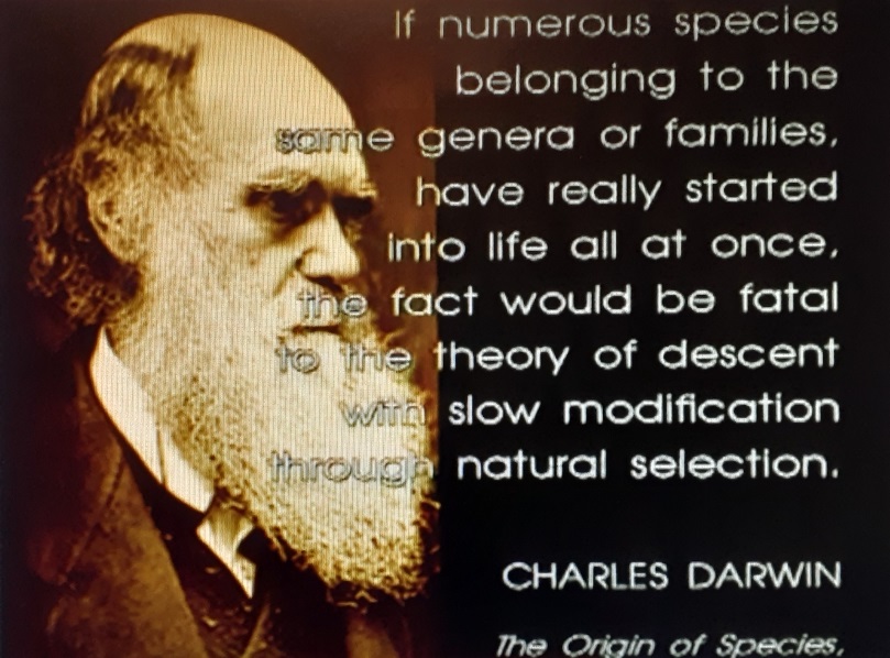 “The abrupt manner in which whole groups of species appear in certain formations has been urged by several paleontologists…as a fatal objection to the belief of a transmutation of species. If numerous species have really started into life at once, that fact would be fatal to the theory of evolution by natural selection.” The invertebrate animal phyla are only represented in the Cambrian rock. The fact that not a single multicellular fossil has been found anywhere in the world in a rock older than the Cambrian rocks is disastrous to Darwin’s case.